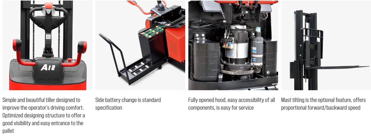 - ความสะดวกสบายและทัศนวิสัย: คันบังคับ (Tiller) ออกแบบมาให้จับถนัดมือ และโครงสร้างตัวรถถูกปรับปรุงให้ผู้ขับขี่มองเห็นพาเลทได้ชัดเจน          ช่วยให้เข้ายกของได้ง่ายขึ้น